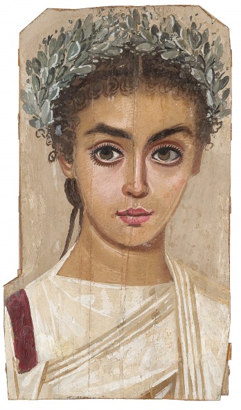 Von den antiken Schriftstellern erfahren wir, dass die Tafelmalerei schon um 350 v. Chr. zur Vollendung gebracht worden war. Wegen der Vergänglichkeit des Materials sind jedoch die Meisterwerke der hoch geschätzten antiken Maler vollständig verloren. Umso wichtiger wiegt es, dass sich die Mumienbildnisse im heißen und trockenen Klima Ägyptens erhalten haben. Sie stehen in der Tradition der griechischen Werkstätten und legen Zeugnis von der Blüte der antiken Malerei ab. Dem Gesicht des Mädchens ist durch dunkle und helle Bereiche (chiaroscuro) Plastizität und Tiefe verliehen. Unter den feinen Stirnlocken liegt ein zarter Schattenwurf, der Nasenrücken ist durch ein Glanzlicht betont, der Nasenschatten durch Schraffur herausgearbeitet. Der römische Schriftsteller Plinius (um 23–79 n. Chr.) berichtet, dass die bedeutendsten Tafelmaler auch mit der Farbfassung der Marmorskulptur beauftragt waren. Tatsächlich müssen wir uns die antike Skulptur ab um 350 v. Chr. mit einer differenzierten Bemalung vorstellen, so wie sie uns das Mumienbildnis vor Augen führt.