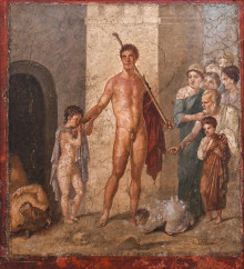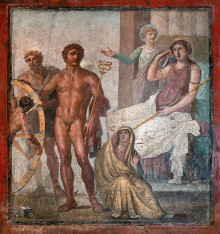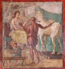 Ein Gemälde im Haus der Vettier (Casa dei Vettii) zeigt Daidalos, den genialen Erfinder, in seiner Werkstatt. Daidalos ist für eine Vielzahl einfallsreicher Ideen bekannt. Nicht zuletzt für die Konstruktion der Flügel, mit denen es ihm gelingt, von Kreta bis nach Sizilien zu fliegen. Sein Sohn Ikaros hingegen hält sich nicht an die „Gebrauchsanweisung“. Als er der Sonne zu nah kommt, schmilzt das Wachs und er stürzt ab – eine bekannte Geschichte. Zuvor hatte Daidalos das Labyrinth auf Kreta gebaut, um darin den Minotaurus gefangen zu halten. Das zerstörerische Wesen halb Mensch, halb Stier, hatte auf Kreta eine Spur der Verwüstung hinterlassen. Das Fresko aus dem Haus der Vettier erzählt, wie dieses Ungetüm gezeugt wurde.
