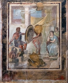 Unter anderem produzierte Hephaist auch eine neue Rüstung für den griechischen Helden Achill, der deshalb wieder in den Kampf um Troja eintrat. Dafür verwendete er Gold, das Material der Götter und – in der Vorstellung – unzerstörbar. Auf einem antiken Wandgemälde aus Pompeji ist die Szene dargestellt, in der Achills Mutter Thetis den Herstellungsprozess aufmerksam verfolgt. Sie war es, die Hephaist aufnahm und großzog, nachdem er hilflos auf der Erde gelandet war. Ähnlich wie in der Szene mit Pasiphae ist auch hier im linken unteren Eck ein Werkstattgehilfe an einem Rüstungsteil beschäftigt.