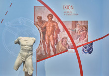 Auch die Geschichte von der Bestrafung des Ixion wird auf einer Wandmalerei im Haus der Vettier dargestellt. Ixion, der König der Lapithen, hatte seinen Schwiegervater in eine Feuergrube geworfen und getötet. Zeus erklärte sich als Einziger bereit, den verstoßenen und geächteten Ixion aufzunehmen. Jedoch stieg diesem das Leben im Olymp zu Kopf – durfte er als Sterblicher sogar am Tisch der Götter sitzen. In einem Anfall trunkener Überheblichkeit kann er sein Verlangen nach Zeus‘ Gattin Hera nicht mehr zurückhalten. Hera ist außer sich. Insbesondere ihrem Mann macht sie Vorwürfe und fordert eine Bestrafung. Zeus beauftragt daraufhin Hephaist, seinen Sohn, ein Objekt zu bauen, das sich mit Feuerantrieb durch den Weltraum drehen kann. Die rundliche Konstruktion im linken Bildabschnitt erinnert an ein Rad, das mit Achsen versehen ist und mit Metallbeschlägen zusammengehalten wird. Ixion wird an dem von Hephaist konstruierten radähnlichen Objekt, welches entfernt an ein Raumschiff denken lässt, gefesselt und von Hermes auf eine endlose und leidvolle Reise geschickt.