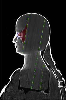 Computertomographische Aufnahmen im horizontalen Querschnitt durch die Mondsichel. Deutlich sind die Augen des Mondgesichts zu erkennen, welches heute durch die später hinzugefügte Wolke verdeckt wird (grün markiert).