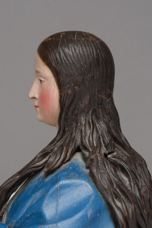 Bei Pedro de Menas Skulpturen wird diese Technik handwerklich perfektioniert. So zeigt sich, dass allein der separat geschnitzte und in den Rumpf eingesetzte Schädel unserer Figur mit einem Durchmesser von nur 5,5 Zentimetern aus mehreren verleimten Holzstücken besteht.
