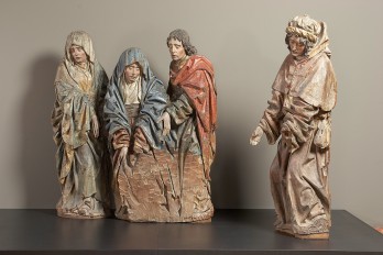 Die vier beeindruckenden Figuren waren Teil einer szenischen Darstellung der Beweinung des vom Kreuz abgenommenen toten Christus. Die Gruppe ist unvollständig, lässt sich aber rekonstruieren. Der biblischen Geschichte und der Bildtradition folgend ist links eine zweite männliche Figur zu ergänzen. Beide Männer, Josef von Arimathia und Nikodemus, hielten ein Leichentuch, in dem der tote Christus auf dem Boden lag. Dahinter stand sein Lieblingsjünger Johannes, der behutsam die Mutter Christi stützt, weil ihr vor Schwäche die Beine den Dienst versagen. Beilspuren im vorderen Gewandbereich bis in Kniehöhe weisen darauf hin, dass später Platz für einen Sarkophag geschaffen und aus der Beweinungs- eine Grablegungsgruppe wurde – möglicherweise um dort im Rahmen von Osterspielen eine Christusfigur niederzulegen. Von links tritt helfend eine weinende Frau heran. Wahrscheinlich besaß sie auf der anderen Seite der Maria-Johannes-Gruppe ein Pendant, und eventuell existierten auch noch weitere trauernde Personen.