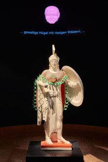 The colour reconstruction is currently on display as part of the special exhibition „Isa Genzken Meets Liebieghaus“ and will remain there until 26 October 2025. It is displayed opposite a work the contemporary artist Isa Genzken entitled “Airplane Window (Medusa)” from 2011: The interior panelling of an airplane wall with two window openings is covered with a photograph of the Mona Lisa on the left and a portrait of the artist herself on the right, both looking upwards. Superimposed on these images is the motif of the famous Medusa shield by the Baroque artist Caravaggio.