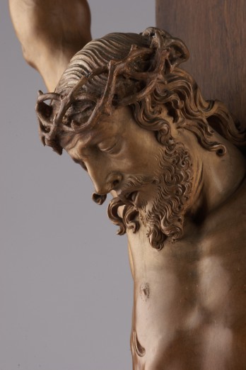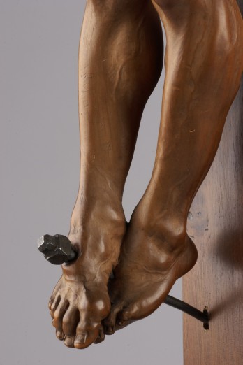 Der tote Christus war im sogenannten Dreinageltypus und mit hoch gestreckten, nur leicht seitlich ausgestellten Armen an das Kreuz geheftet. Aus dem ursprünglichen Zusammenhang des Kruzifix ist nicht das Kreuz, aber ein Totenschädel mit Knochen erhalten. Muskeln, Rippenbogen und die durch die Haut scheinenden Adern des Körpers sind weich modelliert. Arme und Beine, auch die Füße und die verkrampften Hände zeigen gedrungene, kräftige Formen. Der zur rechten Seite auf die Brust herabgesunkene Kopf ist von gelockten Haaren gerahmt. Insbesondere der geöffnete Mund, in dem Zähne und Zunge zu sehen sind, drückt die erlittenen Qualen aus, unterstützt von gerunzelten Brauen und tiefen Stirnfalten unter der filigran gestalteten Dornenkrone.
