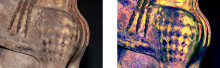 To recreate the armature of the feather patterns on the breast and wings of the sphinx, as well as the application of the colors themselves, Ulrike Koch-Brinkmann and Vinzenz Brinkmann’s team relied on rich scientific findings by The Met scientists, conservators, and Imaging team, including multispectral photographs by Dorothy Abramitis, as well as ultraviolet-visible absorption spectroscopy (UV-VIS) by Heinrich Piening, which were supplemented by further photographs in ultraviolet (UVL) and infrared (VIL) fluorescence and false color (iDStretch app) captured by Vinzenz Brinkmann.