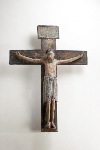 The cross and the plaque with the inscription are original. The inscription itself, however, dates from a later period. Instead of the usual INRI (Iesus Nazarenus Rex Iudæorum = Jesus of Nazareth, King of the Jews), there are six lines of text, of which the final words »WILGEFORTIS OdER KOMMERNUS« are still quite legible. They indicate that, possibly a few hundred years after its execution, the crucifix was rededicated as the image of a female saint who had been worshipped popularly since the fourteenth century: Kümmernis or Wilgefortis, who, like Christ, was depicted as bearded and crucified. According to legend, her father, a pagan king, forced her to marry. When she asked the Virgin for assistance, she grew a beard, whereupon her enraged father nailed her to a cross.