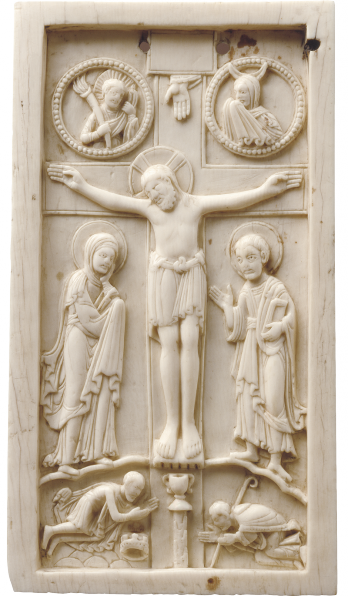 Like so many ivory reliefs, this panel was also once part of a book cover. It illustrates the connection between the Christian Holy Communion and Christ’s sacrifice of his own life. It shows Christ on the cross with his mother, Mary, and his favourite disciple, John. At the sides, two medallions bearing images of the mourning sun and moon in human form symbolize the sympathy of the heavens with Christ’s death. The mound of earth on which Mary and John stand delimits a second region. There the beam of the cross extends down to the lower edge of the relief, from which a tree stump with a chalice grows.