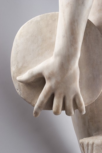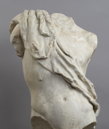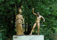 Die Marmorfigur der Göttin Athena vom Bildhauer Myron: In einem Wettbewerb mit dem Meeresgott Poseidon siegt Athena und wird zur Schutzgöttin der Stadt Athen. Der erniedrigte Poseidon rächt sich und schläft mit Gorgo Medusa, der schönsten Frau der Welt, im Tempel der jungfräulichen Athena. Eine ungeheuerliche Provokation für Athena, die zusammen mit dem griechischen Helden Perseus die Gorgo enthaupten wird. Gorgo Medusa war von Poseidon schwanger, daher entspringen im Augenblick ihres Todes ein Junge und ein geflügeltes Pferd – der berühmte Pegasos – aus ihrem blutenden Hals. Athena empfindet Scham über den Mord und erfindet eine wundersame Doppelflöte, um den herzzerreißenden Klagegesang der Schwestern der Gorgo Medusa festzuhalten. Als Athena jedoch beim Blick in spiegelndes Wasser entdeckt, dass das Flötenspiel ihre Schönheit entstellt (das Gesicht läuft blau an), wirft sie das einzigartige Musikinstrument fort. Zur Marmorstatue der Athena im Liebieghaus gehörte ursprünglich die Figur des Satyrs Marsyas, einem wilden Waldgeist, der die weggeworfene Flöte entdeckt und sich zu einem gefeierten Musiker wandelt. Eine Rekonstruktion aus Bronze im Garten des Liebieghauses zeigt die vollständige Gruppe von Athena und Marsyas.