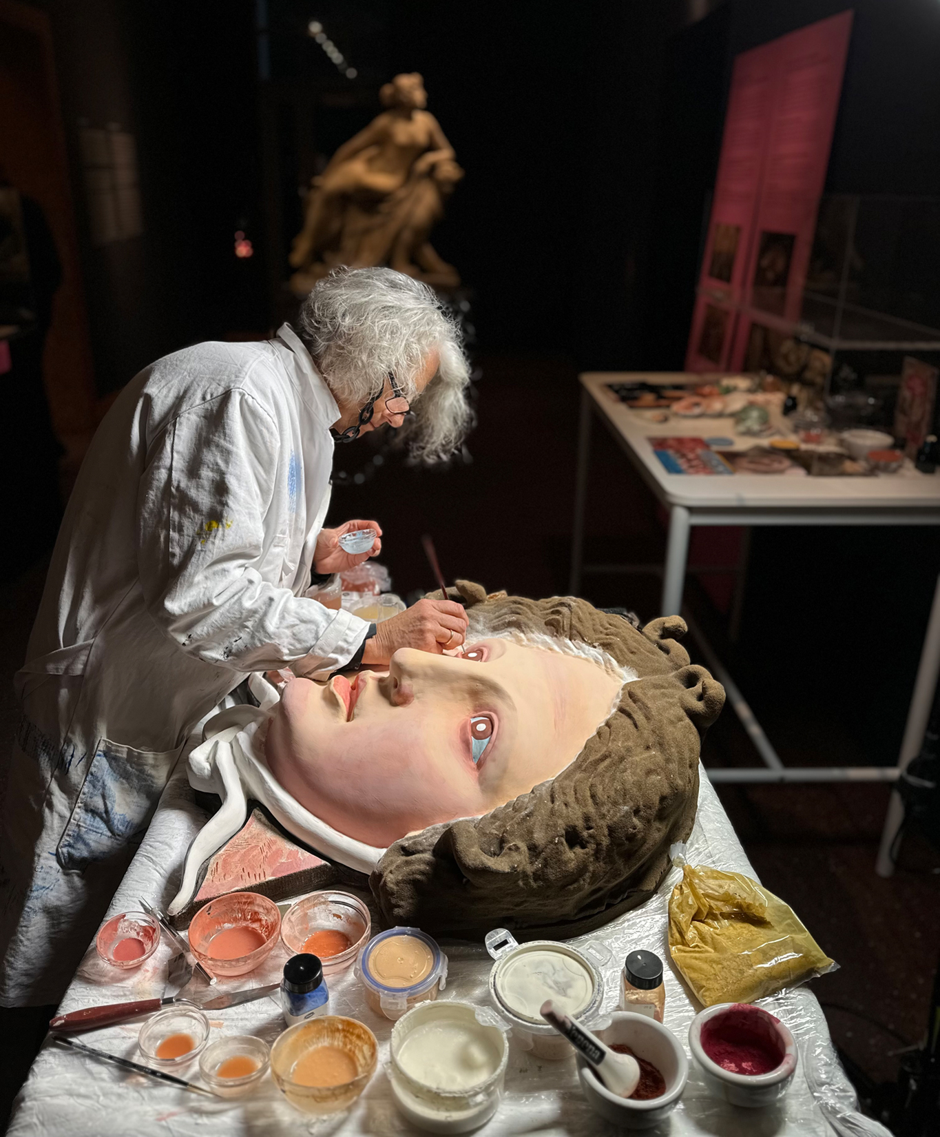Für die abschließende Bemalung in Secco-(Tempera-)Technik hingegen konnte man sich dann wieder mehr Zeit lassen. Der Malprozess, der von der Archäologin Ulrike Koch-Brinkmann in einer offenen Werkstatt durchgeführt wurde, konnte im Oktober 2024 abgeschlossen werden. Eingebettet war die neue Rekonstruktion in eine Projektschau mit dem Titel „Medusas Farben: Ein Projekt der Bunten Götter“ in den Galerien der Antikensammlung des Liebieghauses.