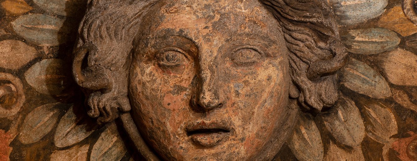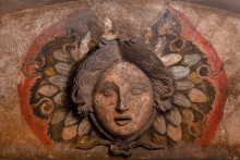 Wissenschaftliche Farbrekonstruktion eines Gorgoneions aus dem Ipogeo dei Cristallini (Neapel)