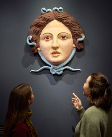 Wissenschaftler des Liebieghauses bekamen jüngst die Gelegenheit, in Neapel die gut erhaltene Farbigkeit einer griechischen, spätklassischen Grabanlage, dem „Ipogeo dei Cristallini“, zu untersuchen. An der zentralen Wand einer der Grabkammern befindet sich die Darstellung eines dreidimensional gearbeiteten Haupts der Medusa – ein Gorgoneion, umgeben von einer gemalten Ägis, dem Brustpanzer der Athena. Die Farbspuren des Gorgoneions wurden mittels verschiedener naturwissenschaftlicher Untersuchungen genau bestimmt. Auf dieser Grundlage entstand in einer eigens dafür eingerichteten Schauwerkstatt eine Farbrekonstruktion des Medusenhaupts. Hierfür wurden ausschließlich originale antike Farbmaterialien verwendet. Ergänzt wurde die Präsentation durch weitere Objekte aus dem Bestand des Museums, die die Geschichte um Athena und Medusa anschaulich machten.