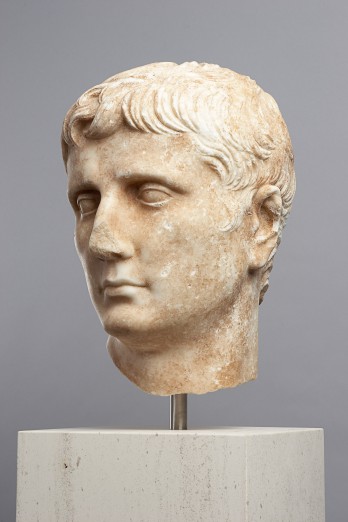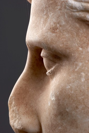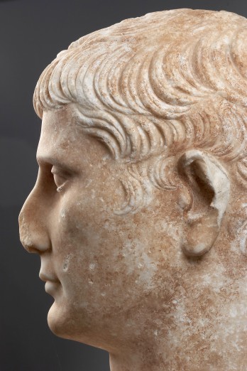 This Frankfurt portrait possesses an especially beautiful surface. The damaged tip of the nose does nothing to diminish the splendid overall impression. The sensuous treatment of the features indicates the sculpture’s dependence on late Greek workshops. The forms of the face are ageless and idealized. The recognizability of the figure is ensured by individualized features, including the sensuous but restrained mouth and the rendering of the forelocks. Referred to as “claw” and “fork” by archaeologists, these idiosyncratic hair motifs are reserved for the portrait of the emperor and rule out any possibility of confusion.