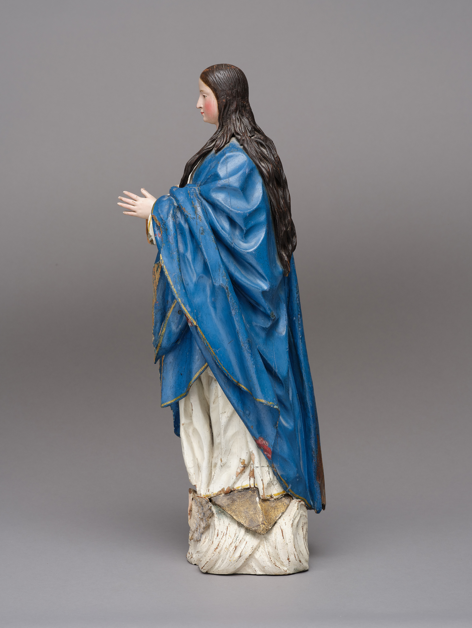 The iconographic depiction of the Virgin Mary standing on a crescent moon is known as the “Maria Inmaculada Concepción”. The figure of “Mary Immaculate” was so popular in 1600s Spain that she was declared the patron saint of the entire country. Owing to its stylistic and technological features, the Frankfurt Inmaculada can be attributed with certainty to one of the most well-known and highly admired sculptor of seventeenth-century Spain: Pedro de Mena.