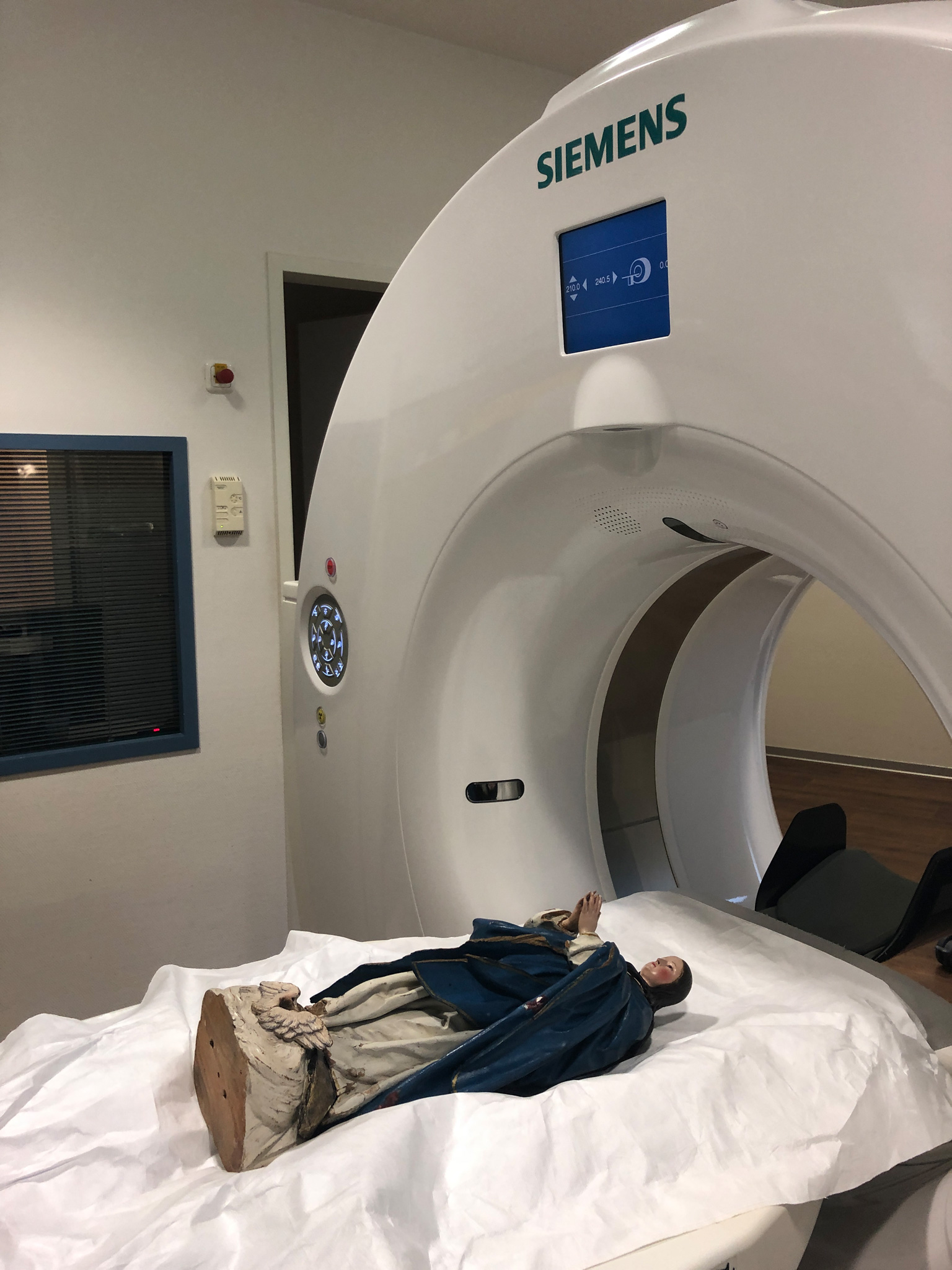 One disadvantage of the optical preliminary examination is that it only records the exposed surface of the sculpture. However, many insights can only be gained by looking at the internal structures. The use of computer tomography and X-rays is particularly recommended for complex wooden constructions such as that of the Frankfurt Inmaculada. Thanks to the medical care centre Dr. Neumaier & Kollegen in Regensburg, CT scans could be made. These showed all the joints in the work block, which is made up of many wooden parts.