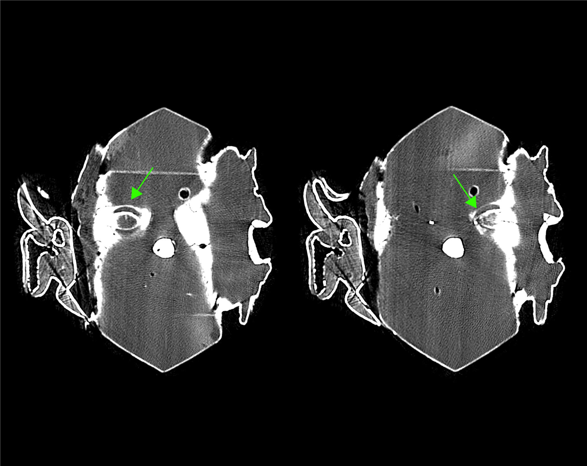 CT scans in horizontal cross-section through the crescent moon. The eyes of the moon’s face can be clearly recognized, which is now obscured by the cloud that was added later (marked in green).