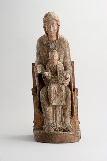 The mobile sculptural objects surviving from the Salian era (1024–1125) are largely limited to crucifixes and sculptures of the Virgin Enthroned with the Christ Child. The figure shown here was executed around 1050, probably in Koblenz, Trier, or Cologne, and is one of the earliest and most significant examples of this period. It is said to have come from the hospice church in Kapellen-Stolzenfels near Koblenz. Yet such sculptures were not found widely in churches at the time. Rather, they were reserved for more important collegiate churches, monastery churches or cathedrals, where they functioned as special cult images on—or immediately adjacent to—the altar, or as processional figures.