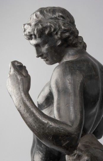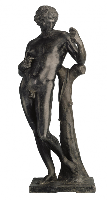 The slender figure of the youthful Apollo leans against the stump of a tree, his left foot resting on the tree-root. He looks pensively towards the left, following the direction of his hand, which holds some object of which only a fragment has survived. As his model for this composition, the sculptor Georg Raphael Donner looked to a work in the collection of the Princes of Liechtenstein, the bronze sculpture “Apollo and Cupid” executed by François Duquesnoy (1579–1643) between 1630 and 1640 and still in that collection. Before long, however, Duquesnoy’s group came to be seen as a work of antiquity. It was no doubt this error that caused Donner to attribute to the bronze figure the exemplary quality generally reserved for classical sculptures. Whereas Duquesnoy’s Apollo is instructing Cupid in archery, Donner focuses only on the main figure, omitting the little god of love. By eliminating the narrative context, Donner simplifies and clarifies that supposed product of antiquity.