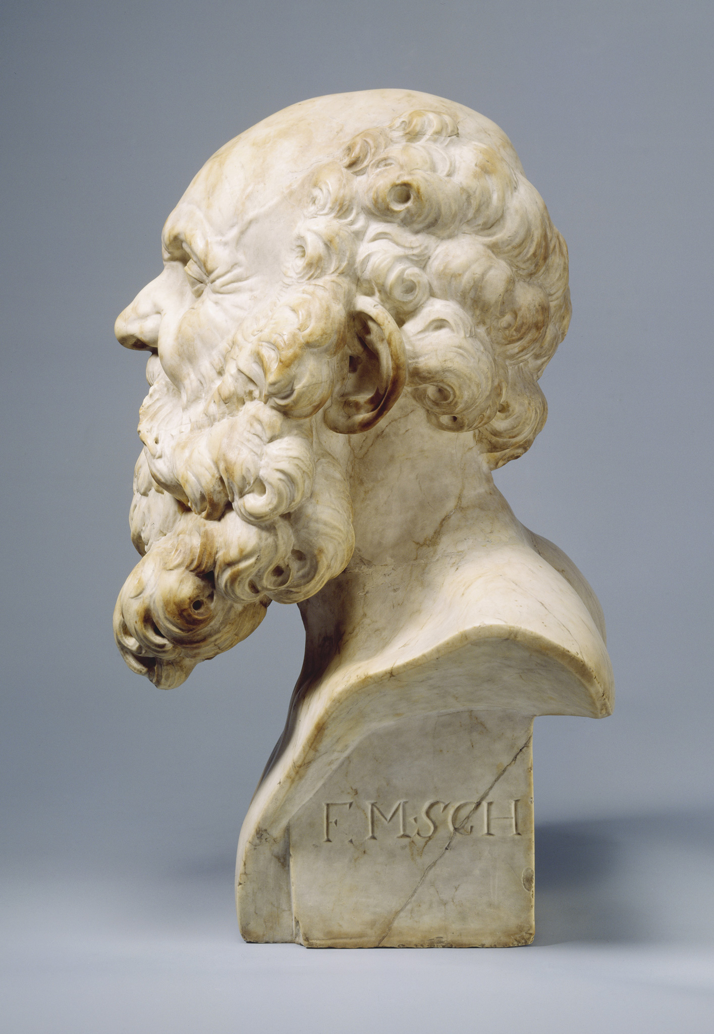 The expressive head of the old man is set on a V-shaped section of his chest, which is in turn supported by a rectangular plinth. The area around the mouth and chin is concealed under a luxuriant beard and moustache. Amidst the mass of facial hair, only the mouth opening and beard offer anatomical points of reference. Although this bust is reminiscent of portraits of Socrates, Messerschmidt has here executed neither an individual portrait nor a mask representing a particular facial expression.