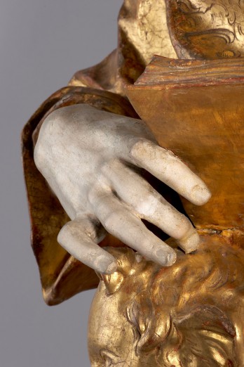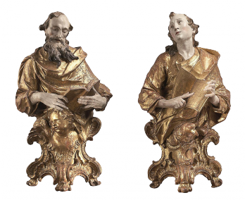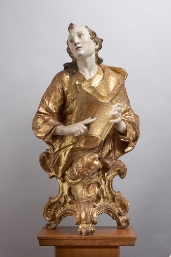 The two half-length figures rest on three-footed pedestals; the ecorative spiral scroll on the front of each pedestal bears the symbol of the Evangelist in question. Each figure holds an open book in his hands. The beardless John points to a passage of text with his index finger, while Matthew appears immersed in his reading. The gilded garments generously draped around the figures are decoratively carved to imitate precious brocades. They form a striking contrast to the pale, pastel-coloured areas of bare skin. Compared to the strong emotionalism of Baroque sculpture, these busts have a simpler, introspective quality that can perhaps be described as raptly lyrical.
