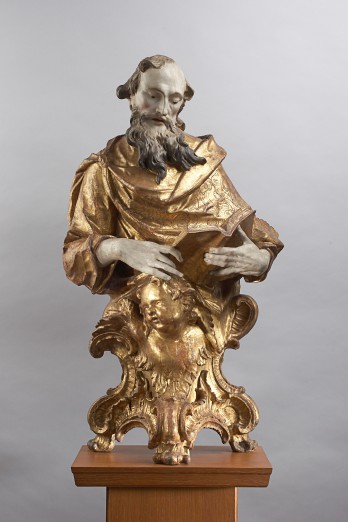 His workshop also produced great numbers of busts of saints on pedestals with rocaille ornaments—decorative elements in the form of seashells and scrolls that were extraordinarily popular in the Rococo period. Jorhan’s busts of saints include several cycles of the four Evangelists. The two Evangelists in the Liebieghaus, Matthew and John, have companion pieces—Mark and Luke—now in Berlin and Oxford. They were all probably intended for the high altar of the pilgrimage church of Maria Thalheim in Landshut.