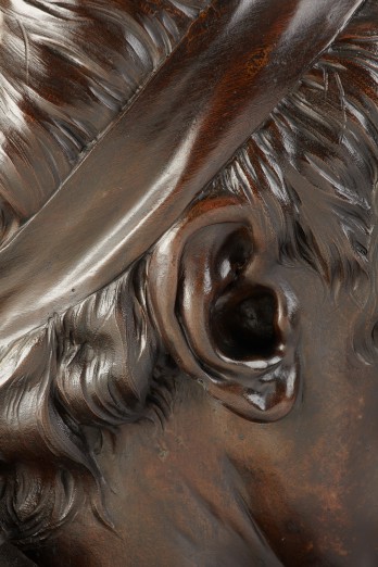 Executed at the peak of Houdon’s career, the Rousseau bust is convincing above all by virtue of its remarkable vibrancy and verisimilitude. It shows the famous philosopher in the antique-style herm form quite popular at the time. He is wrapped in a toga and wears a headband Houdon referred to as the “ribbon of immortality” in his hair. The high quality of the Liebieghaus acquisition is manifest in the artist’s shrewd penetration of his sitter’s physiognomy but also in his masterful treatment of the surface. No other sculptor of Houdon’s time knew how to capture their model’s facial features and character as well.